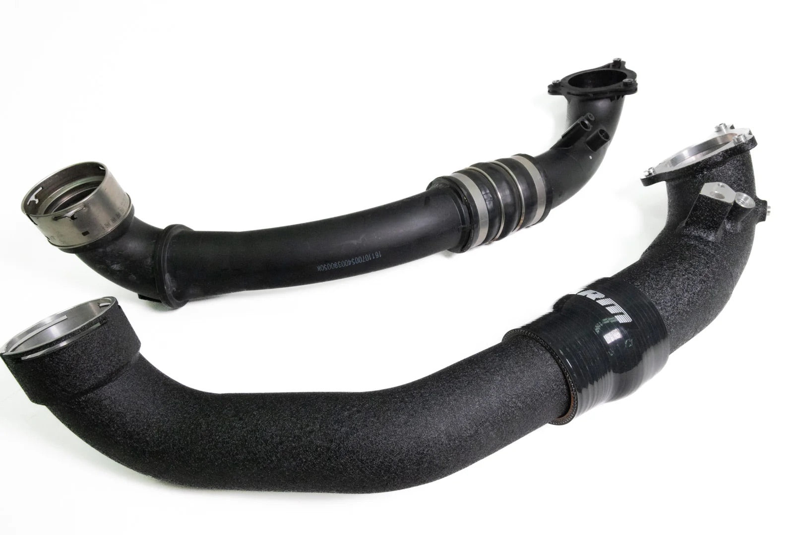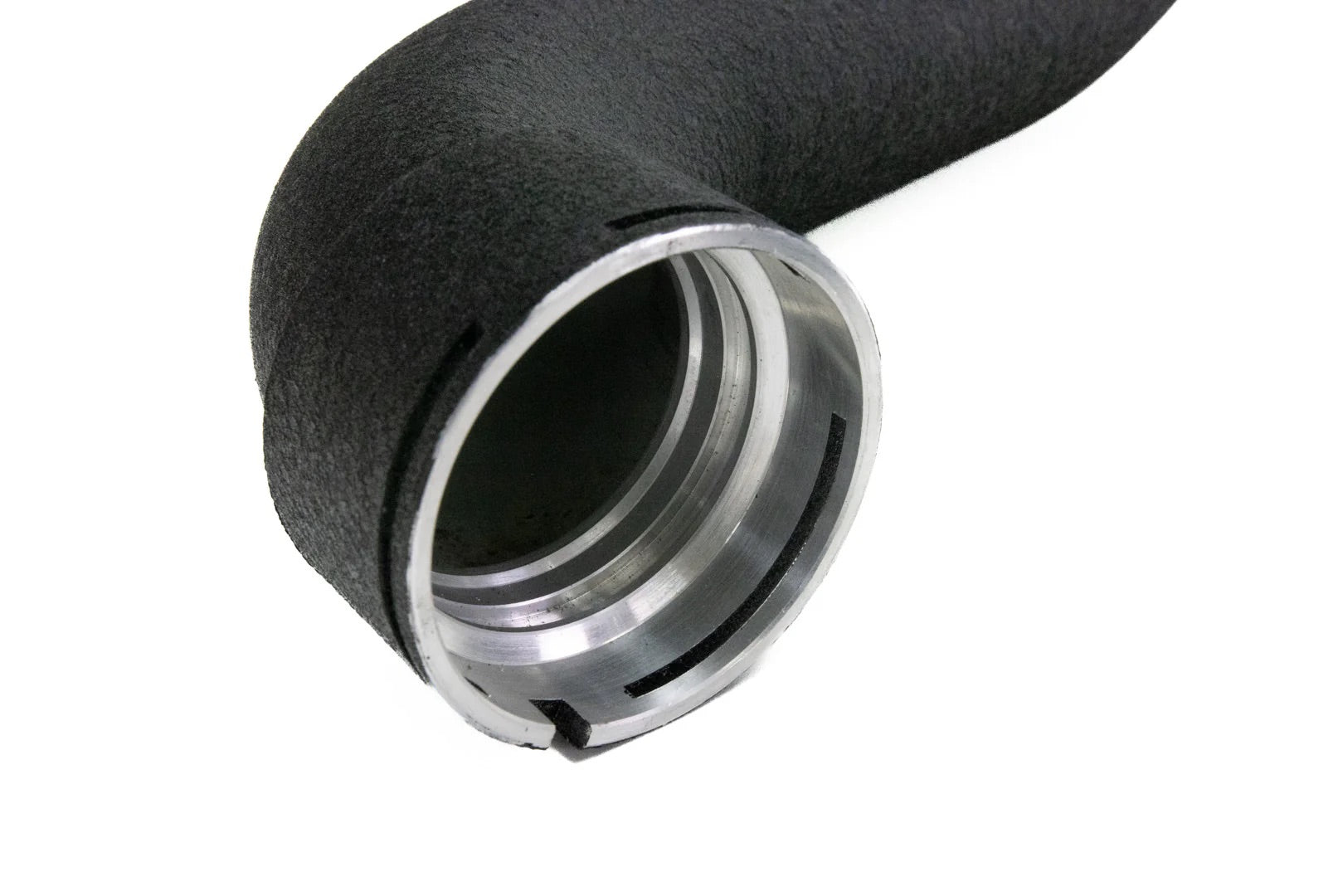 The 6 layer reinforced silicone coupler connects the 2.5" piping to the larger 3" upper charge pipe section. This runs all the way to the CNC 3-bolt throttle body flange. The silicone coupler is secured using our constant tension T-bolt clamps to ensure that the connection doesn't loosen over time. The upper charge pipe incorporates machined connections for the temperature and MAP sensors to ensure a precise fit.