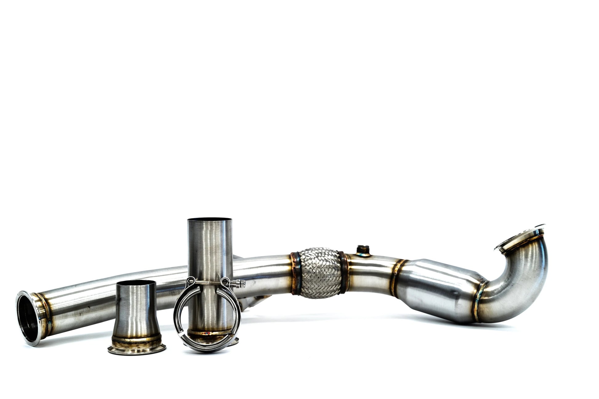 The ARM MK7 GTI Downpipe kit comes with both a 2.5" reducer to connect to the stock exhaust system, and a straight 3" adapter to connect to upgraded cat-back exhaust systems. This connection utilizes a CNC machined v-band system for connecting between the downpipe and adapter of your choice. The v-band is a superior connection type compared to a slip-fit or bolt on connection as it maintains a more study and reliable seal between the two ends.